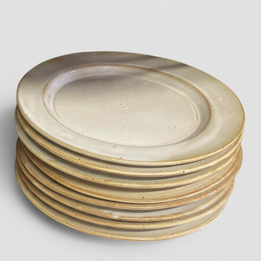 Traditions Pottery, crafted by Michael Calhoun of Blowing Rock, NC, offers dinner plates ranging from 10" to 11" in diameter and 1/4" variance between plates. Orders can be placed year-round, yet production often stops after June and resumes after Christmas. An immense variety is available, including individual plates, salad plates, mugs, bowls, and 4-piece place settings.